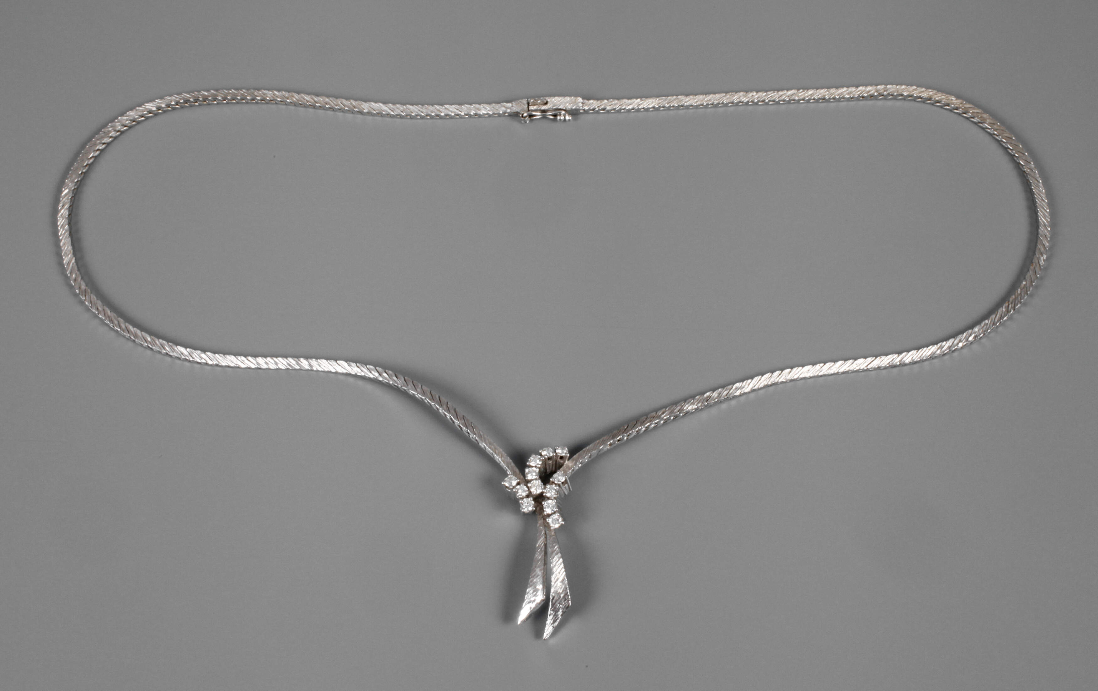 um 1970, Weißgold gestempelt 750, Mittelteil besetzt mit zwölf Brillanten von zusammen ca. 0,5 ct, an gedrückter Fuchsschwanzkette, Kastenschloss, L ca. 44 cm, G ca. 28,4 g.