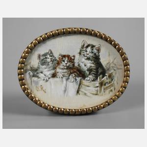 um 1900, monogrammiert CR, Gouache auf Platte, possierliche Darstellung dreier Kätzchen im Korb vor monochromem Fond, laut Einliefererangabe möglicherweise Carl Reichert, hinter Glas in Messingrahmen gefasst, L 4,5 cm.