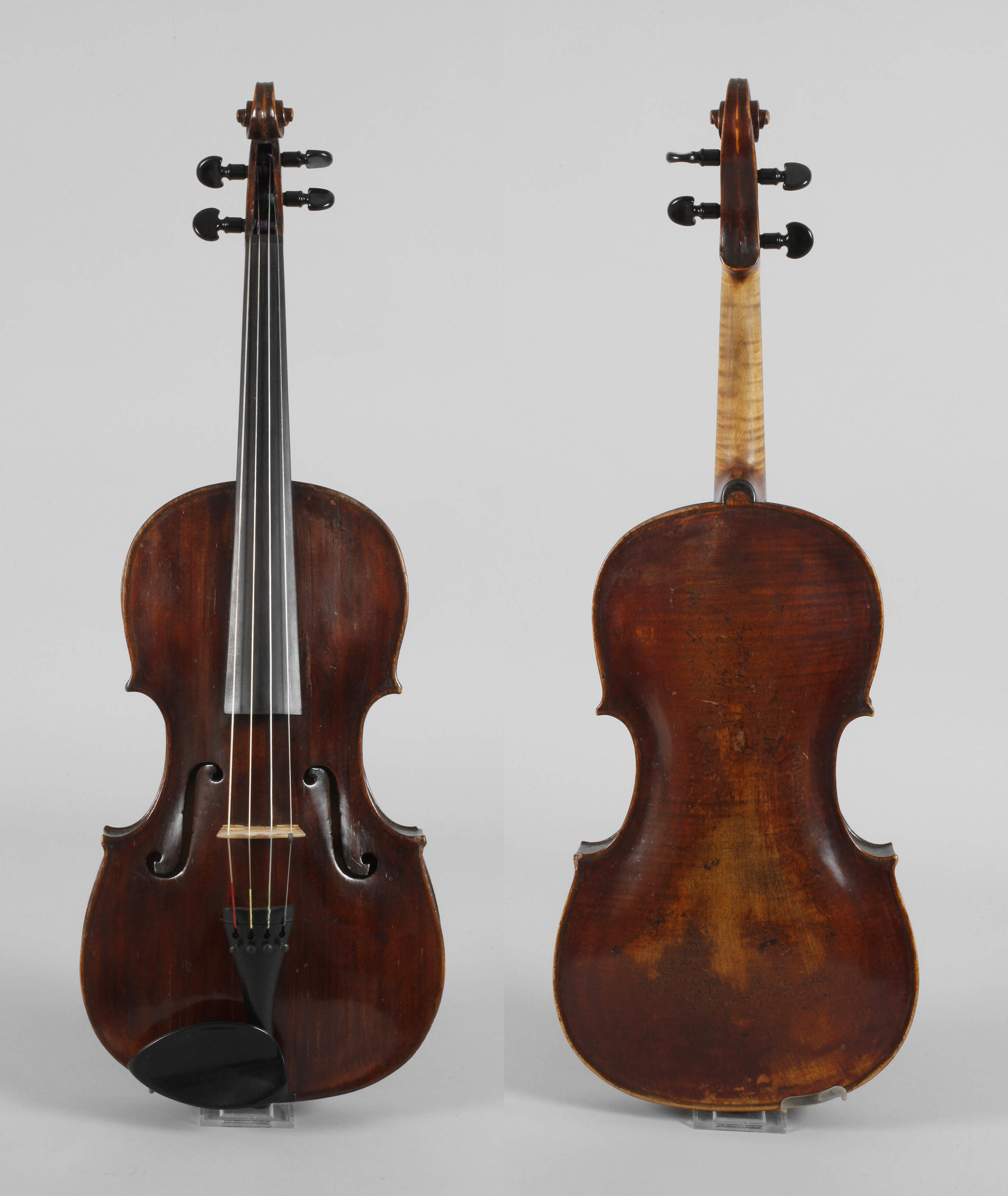 mit Zettel Johann Georg Thier, Lauten- und Geigenmacher in Wien 1747, sowie Zettel Anton Widmann in Wien 1972 (Reparatur), angeschäftet, schöner brauner Lack, alt repariert, spielbereiter Zustand, dazu zwei Bögen, ein Silberbogen gestempelt R. Hageman sowie Neusilberbogen gestempelt Roderich Paesold, spielbereit, im Kasten, L Korpus 39 cm.
