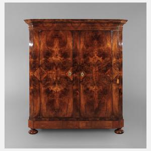 2. Hälfte 18. Jh., Nussbaummaser auf Nadelholz furniert, komplett zerlegbarer zweitüriger Korpus mit abgeschrägten Ecken, im Sockel zwei flache Schubkästen, innen ein Regalboden, wohnfertig restauriert, mit Schlüssel, Maße 198 x 184 x 62 cm.