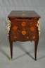 wohl Frankreich, 2. Hälfte 18. Jh., Eiche und Nussbaum massiv, verschiedene Edelholzfurniere, teils brandschattiert und eingefärbt, frei im Raum stellbares Kleinmöbel, allseitig bombiert und mit Rosendekor intarsiert, feuervergoldete Zierbeschläge aus Bronze, Deckplatte seitlich klappbar, mittig mit aufstellbarem Spiegel, daneben zwei herausnehmbare Kästen, mit altem marmorierten Papier ausgekleidet, Front mit vier Schubkästen und einer Ablage mit Lederbespannung, alt restauriert, ein Lederbändchen fehlt, Maße 74 x 83 x 48 cm.