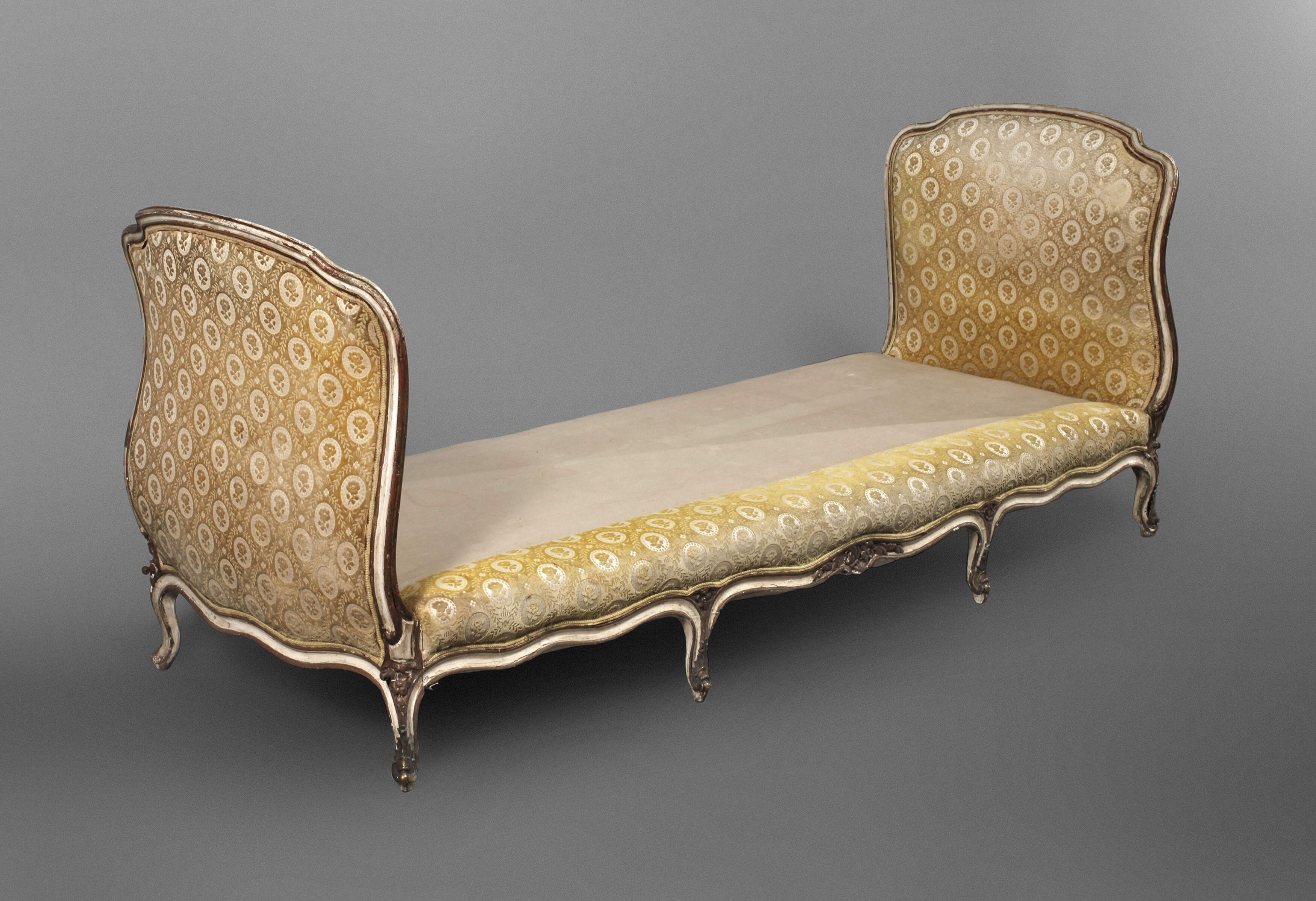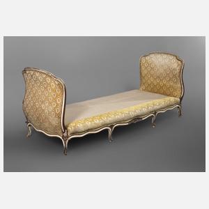 Mitte 18. Jh., Gestell aus Hartholz, umlaufend profiliert, die Zarge floral beschnitzt, weiß gefasst und partiell vergoldet, Bronzesabots, zerlegbares Gestell, Sitzauflage fehlt, Bezug verschmutzt, Alters- und Gebrauchsspuren, rest.bed., Maße 90 x 220 x 80 cm. Nach Angabe des Einlieferers aus Schloss Pullach bei München.