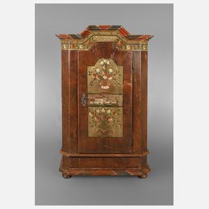 im Gesims Ortsbezeichnung Ortenburg und datiert 1826, eintüriger Schrank in originaler Farbfassung, Tür mit Ansicht des Schlosses Ortenburg bei Passau und zwei Blumenbuketts geschmückt, originales Schloss und Schlüssel, normale Alters- und Gebrauchsspuren, Maße 177 x 116 x 55 cm.