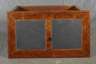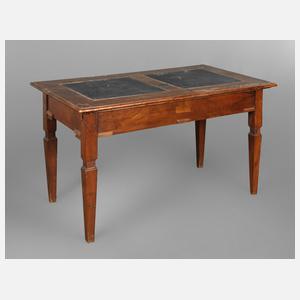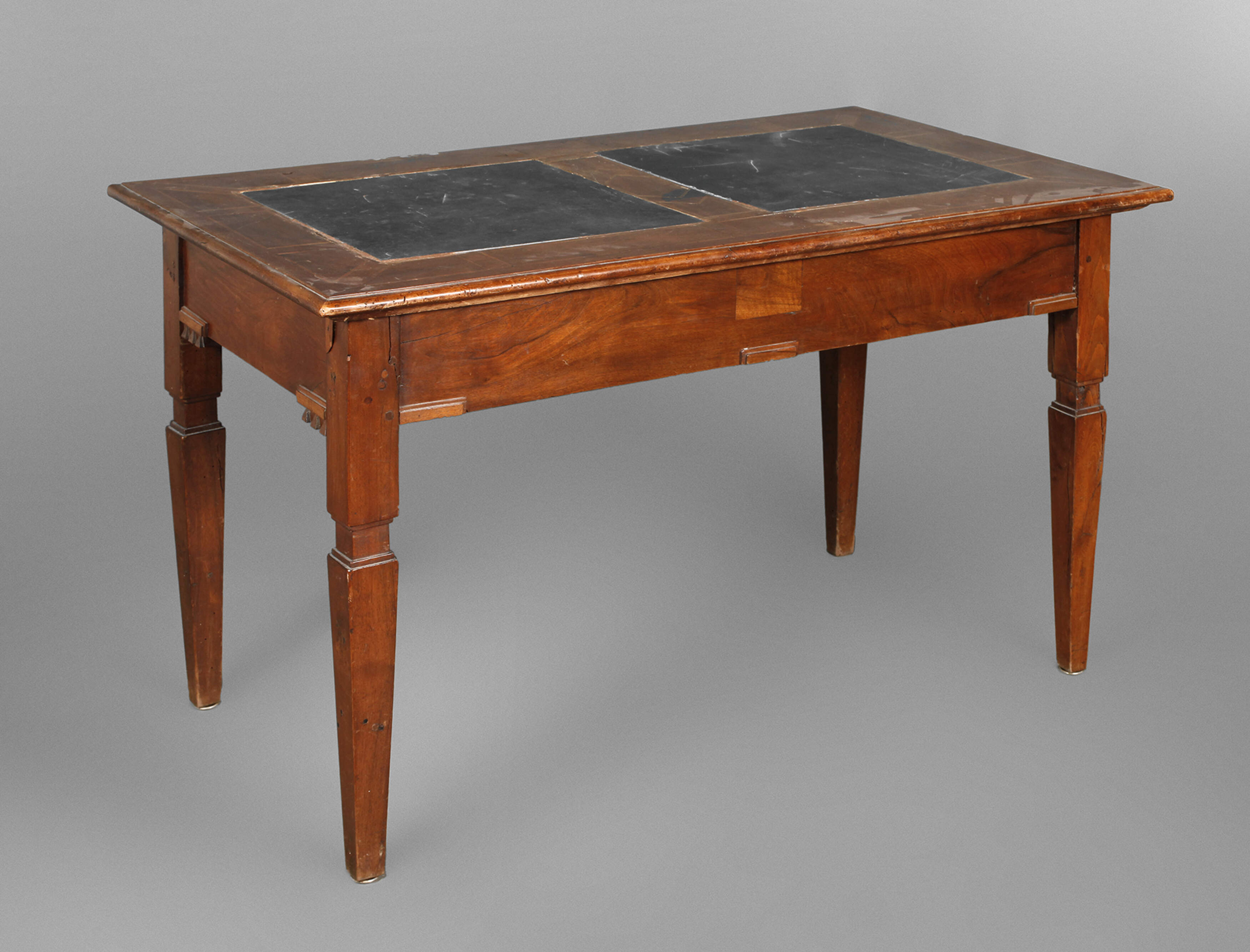 um 1780, Nussbaum massiv und teilfurniert, Platte mit geometrischen Einlegearbeiten in Ahorn, die zwei eingesetzten Schieferplatten erneuert, Platte lose, Beine gekürzt, restaurierungsbedürftig, Maße 65 x 112 x 63 cm.
