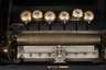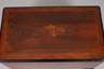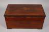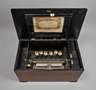 um 1900, ungemarkt, mahagonifurniertes Gehäuse mit umlaufenden Ziereinlagen und intarsierten Blütenbuketts, das ebonisierte Innenleben verglast, massives Walzenspielwerk mit sechs zuschaltbaren Glocken, Deckelinnenseite mit handschriftlicher Angabe der zwölf Melodien, Stimmkamm intakt, Werk läuft, reinigungsbedürftig, Altersspuren, Maße 33 x 68 x 38 cm.