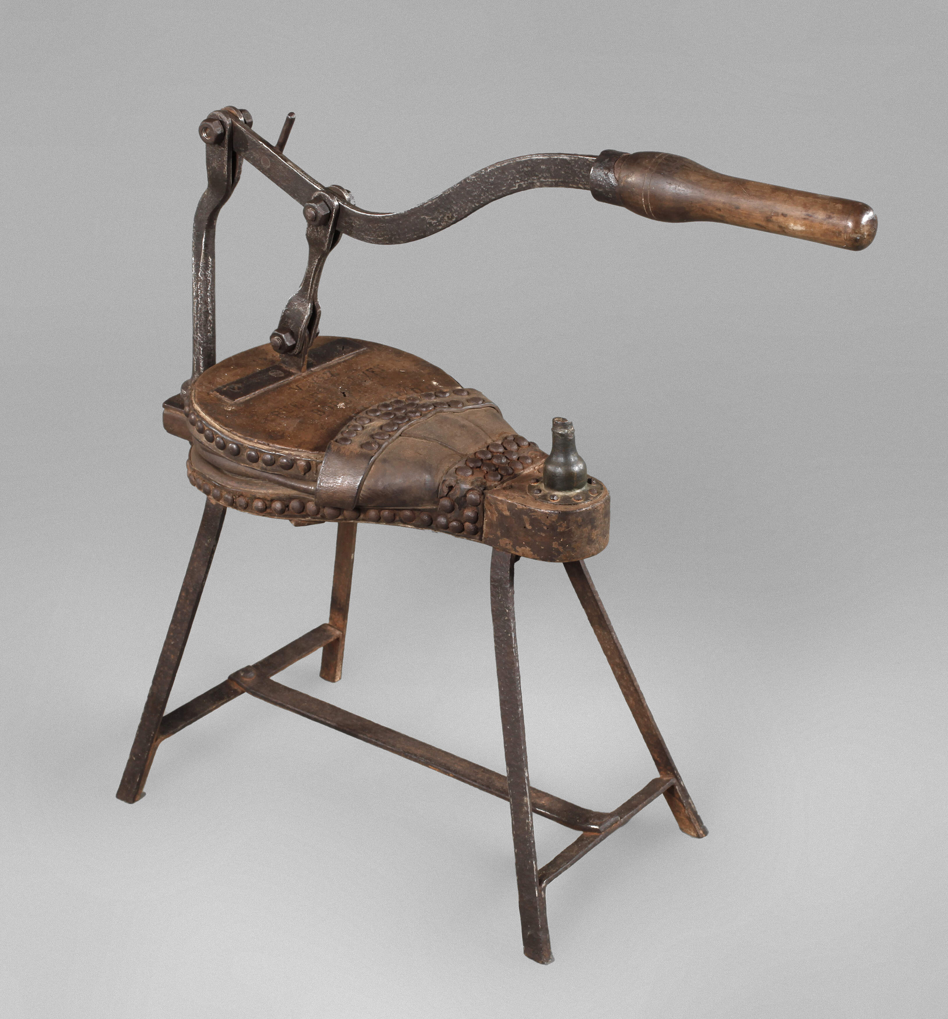 Frankreich, Anfang 18./19. Jh., auf dem Holz gemarkt Vivez, Rue des Douver Bordeaux, vermutlich für kleines Schmiedefeuer, schmiedeeisernes Gestell, Lederbesatz, Alters-, Gebrauchs- und Korrosionsspuren, funktionstüchtig, H 65 cm.
