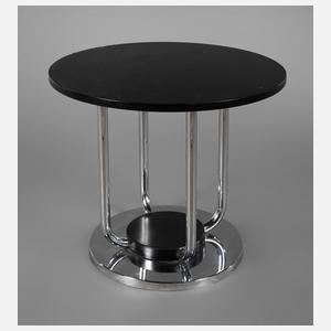 Frankreich, 1930er Jahre, verchromter Scheibenfuß mit vier gebogenen Beinen, runde Holzplatte mit originalem schwarzen Schleiflack, Oberfläche mit Alters- und Gebrauchsspuren, Chrom Z1-2, H 50 cm, D 60 cm.