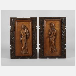 deutsch, 1920er Jahre, unsigniert, fein geschnitzte Darstellung zweier Halbakte in antikisierenden Gewändern, in ebenfalls geschnitztem Rahmen, verziert mit Art déco Motiven, dunkelbraun gebeizt, guter Zustand, Maße je 51 x 33 cm.