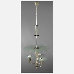 um 1925, schlankes verchromtes Metallgehäuse in Kegelform, mit drei c-förmig gebogten kurzen Leuchterarmen, insgesamt vierflammig elektrifiziert, die Schirme als Kreissegmente aus teils satiniertem Klarglas, minimale Altersspuren, H ca. 100 cm, D ca. 40 cm.