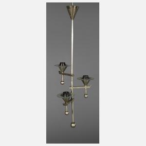 um 1920, schlankes Gestänge aus vernickeltem Metall, um den Mittelschaft reihen sich auf unterschiedlicher Höhe drei kurze Ausleger mit Lampenfassung, diese jeweils mit aufgelegter satinierter Klarglasscheibe, Altersspuren, Flugrost, H 125 cm, D 30 cm.