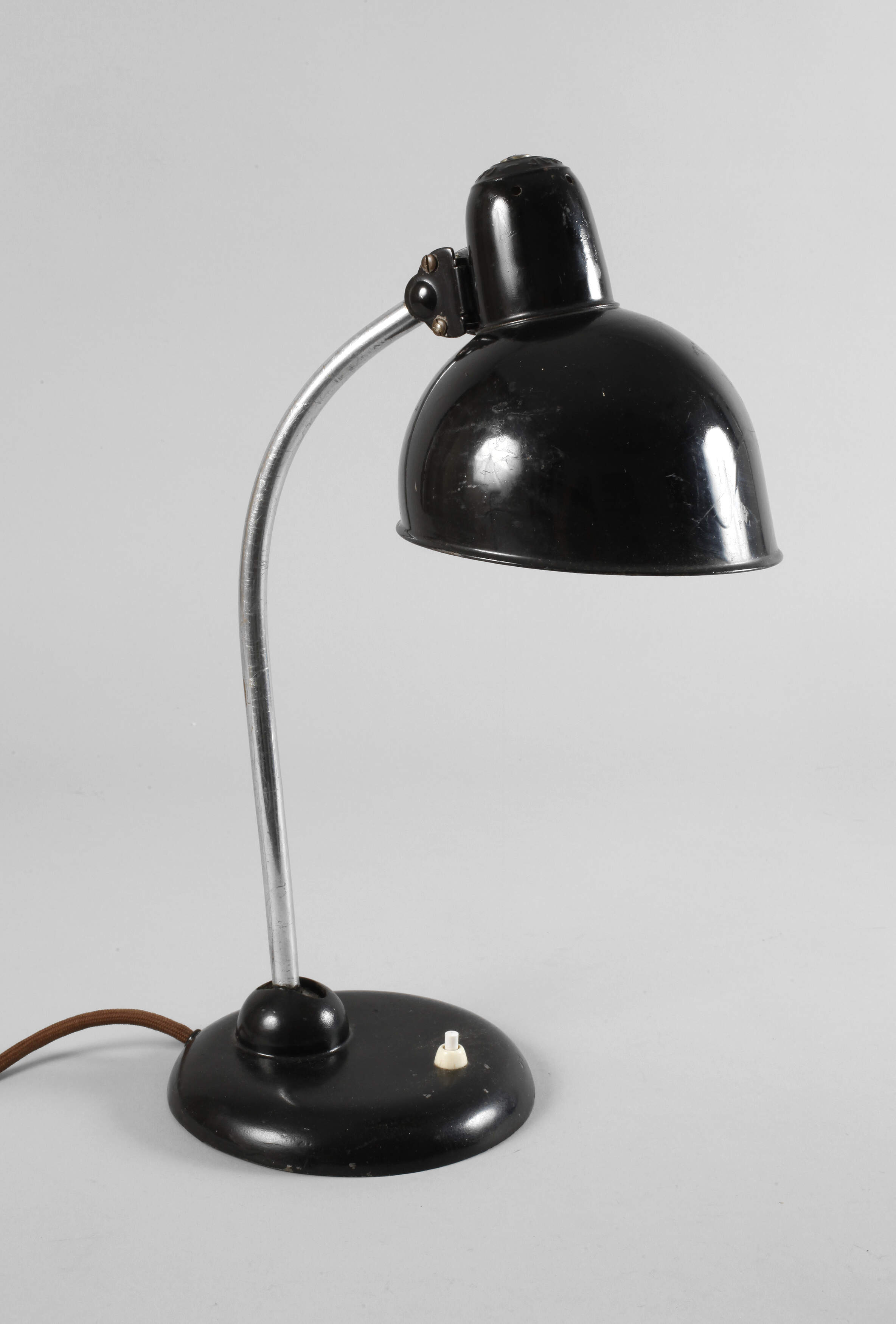 Entwurf Christian Dell, 1930er Jahre, gemarkt, beschwerter geschwärzter Gussfuß mit neigbarem verchromten Leuchterarm und an Kugelgelenk flexibel arretierbarem Kuppelschirm, Altersspuren, Elektrik restaurierungsbedürftig, H ca. 45 cm.