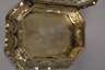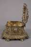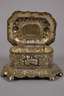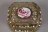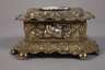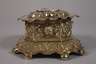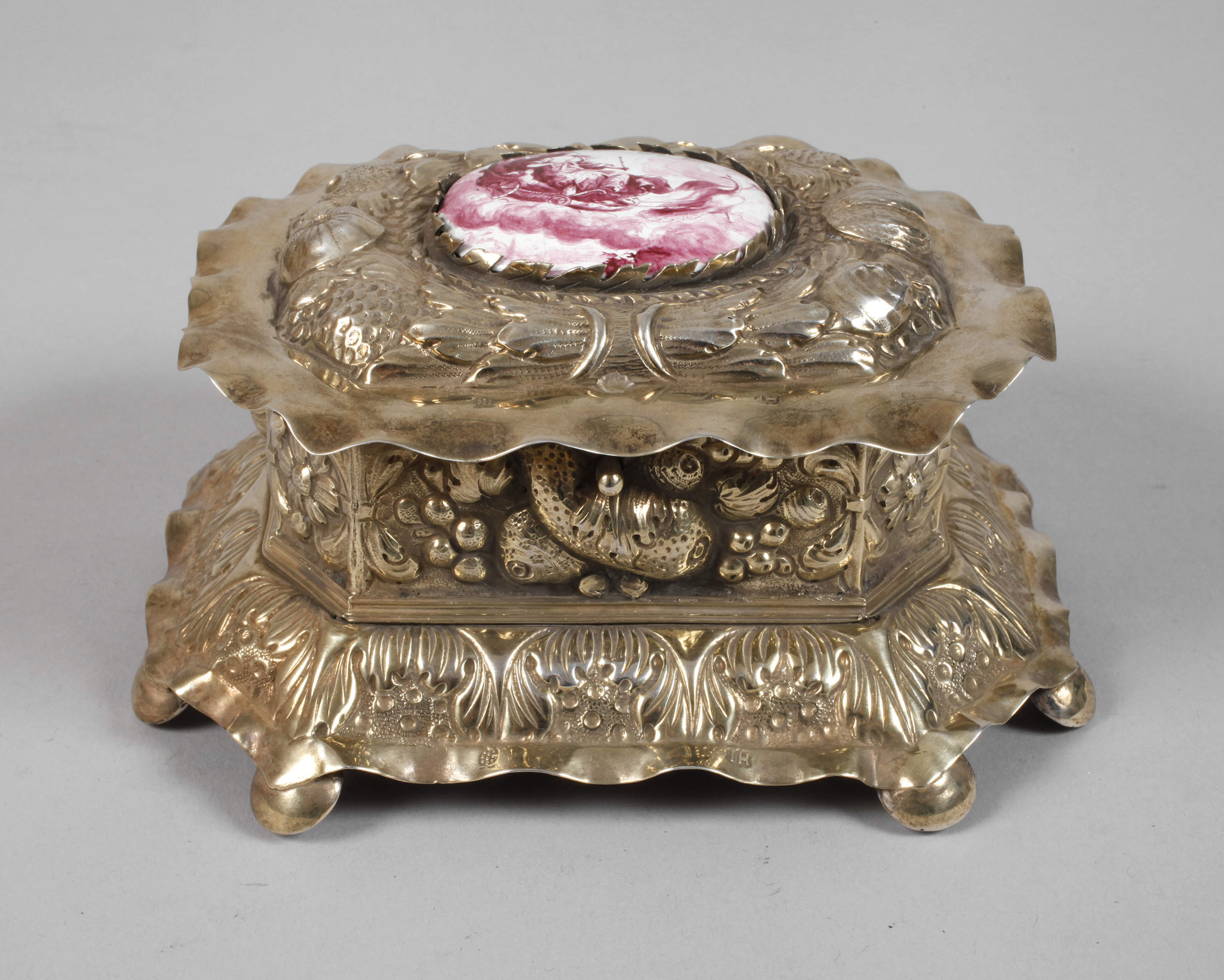 Johann Haltenwanger, um 1691-95, Silberstempel Augsburger Zirbelnuss, Jahresbuchstabe B, Meistermarke JH, feinst getrieben und vergoldet, oktogonale Form mit ausgestelltem Stand auf acht gedrückten Füßchen, reich verziert mit stark reliefierten Blüten und Früchten, gewellte Ränder, scharnierter Klappdeckel mit Druckverschluss, eingesetzte emaillierte Plakette, feine Malerei Göttin Juno mit von Pfauen gezogenem Wagen, Plakette mit winzigem Chip, Fassung der Plakette mit zwei fehlenden Zähnchen, L 13,5 cm, G ca. 226 g.