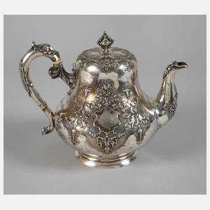 Silberpunze Lion Passant, Leopards Head für London, Jahresbuchstabe r für 1872, Gravur: "H & H v. K. from Baroness de Bunzen 1873", reich verziert mit verschlungenen Bandmotiven, Blättern und Ziselur im Hintergrund, rückseitig scharnierter Klappdeckel, Isolierscheiben aus Bein, normale Gebrauchs- und Altersspuren, H 19 cm, G ca. 733 g.