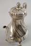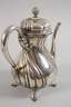 1. Hälfte 20. Jh., Silber gestempelt Halbmond, Krone, 800, Herstellermarke Körner & Proll/Berlin, auf vier ausgestellten C-Füßen stehende bauchige Kanne mit Ohrenhenkel, gedreht gerippte Barockform, Isolierscheiben aus Horn, rückseitig scharnierter Klappdeckel mit gedrehtem Kugelknauf, Alters- und Gebrauchsspuren, H 25,5 cm, G ca. 596 g.