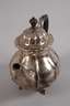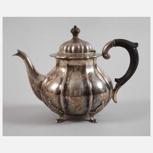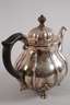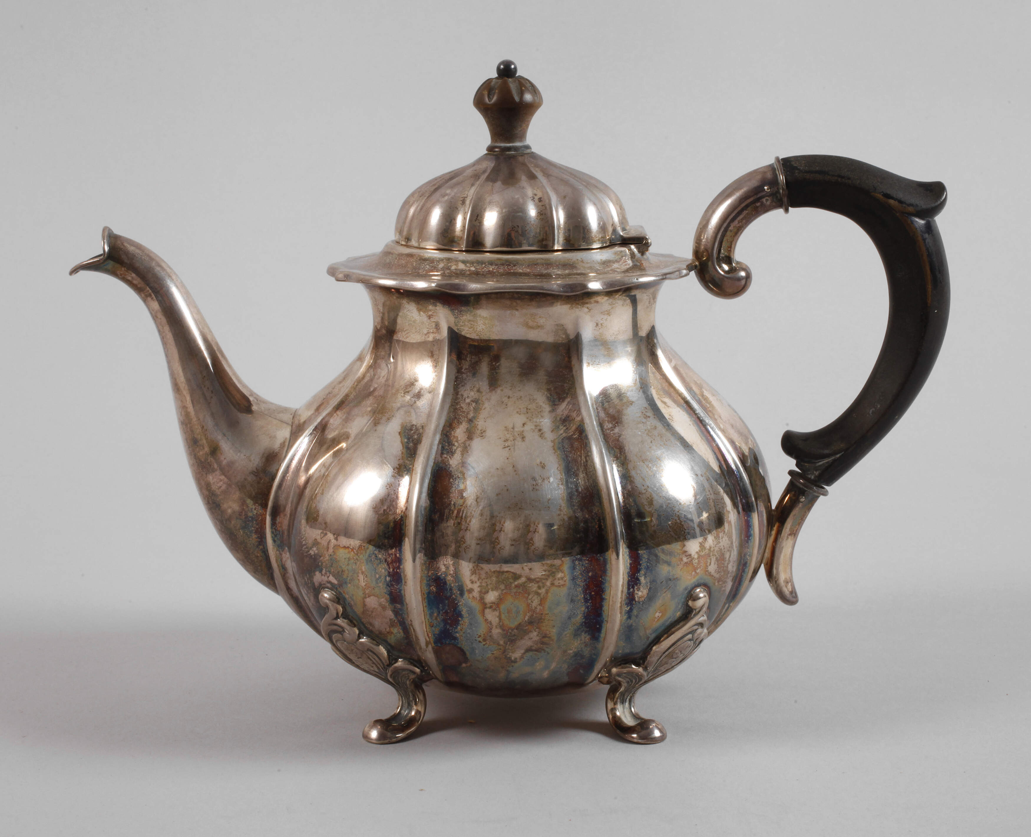 Silber gestempelt Stadtmarke 1938, Beschaumarke JS im Oval für Johannes Siggaard (1932-1960), vertikal gerippte, ovale Form auf blütenverzierten Füßen, rückseitig scharnierter Klappdeckel, geschwärzter Holzhenkel und Knauf, normale Gebrauchs- und Altersspuren, H 27 cm, G ca. 686 g.