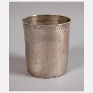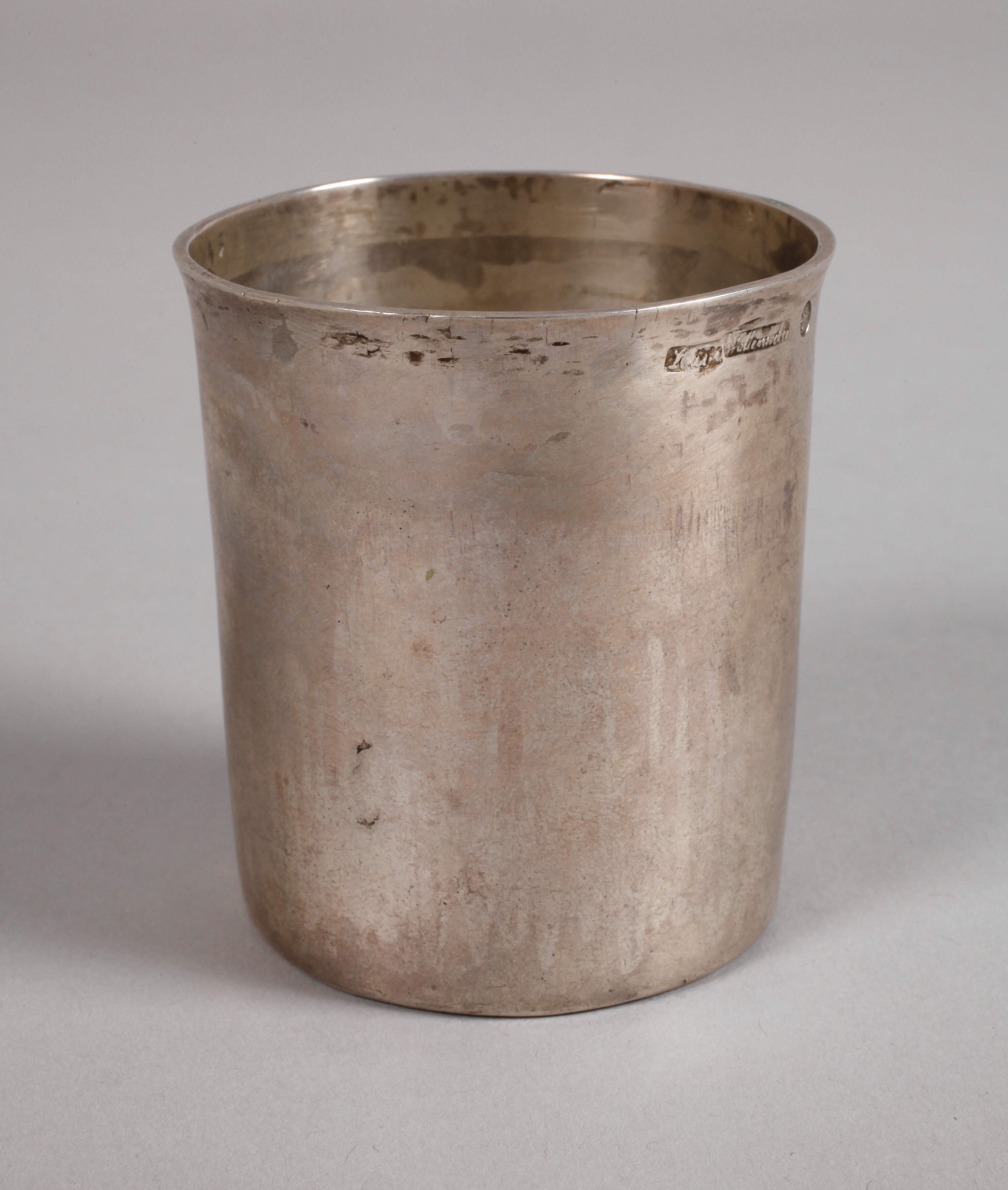 um 1820/30, Silber gestempelt München mit Jahreszahl (19)32, Meisterpunze Louis Wollenweber, erwähnt ab 1819 im Lehrlingsbuch, schlichter Becher mit rundem Stand und leicht konischer Wandung, minimal ausschwingender Mündungsrand, Alters- und Gebrauchsspuren, H ca. 6,3 cm, G ca. 59 g. Quelle: Marc Rosenberg, Der Goldschmiede Merkzeichen, Frankfurter Verlagsanstalt, Frankfurt am Main 1923, S.353, Nr. 3588.