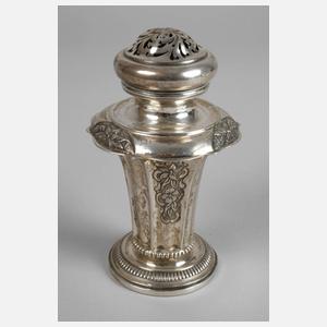 Mitte 19. Jh., Silberpunze mit Buchstabe A und 13 Lot, Meisterpunze FT im Rechteck, fein getrieben, mit gravierten Blüten und umlaufenden Reliefbändern, vertikal gerippt, zartes Besitzermonogramm "CS"?, schraubbarer, floral durchbrochener Deckel, guter altersgemäßer Zustand, H 13,5 cm, G ca. 138 g.