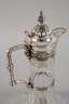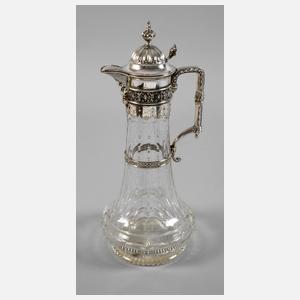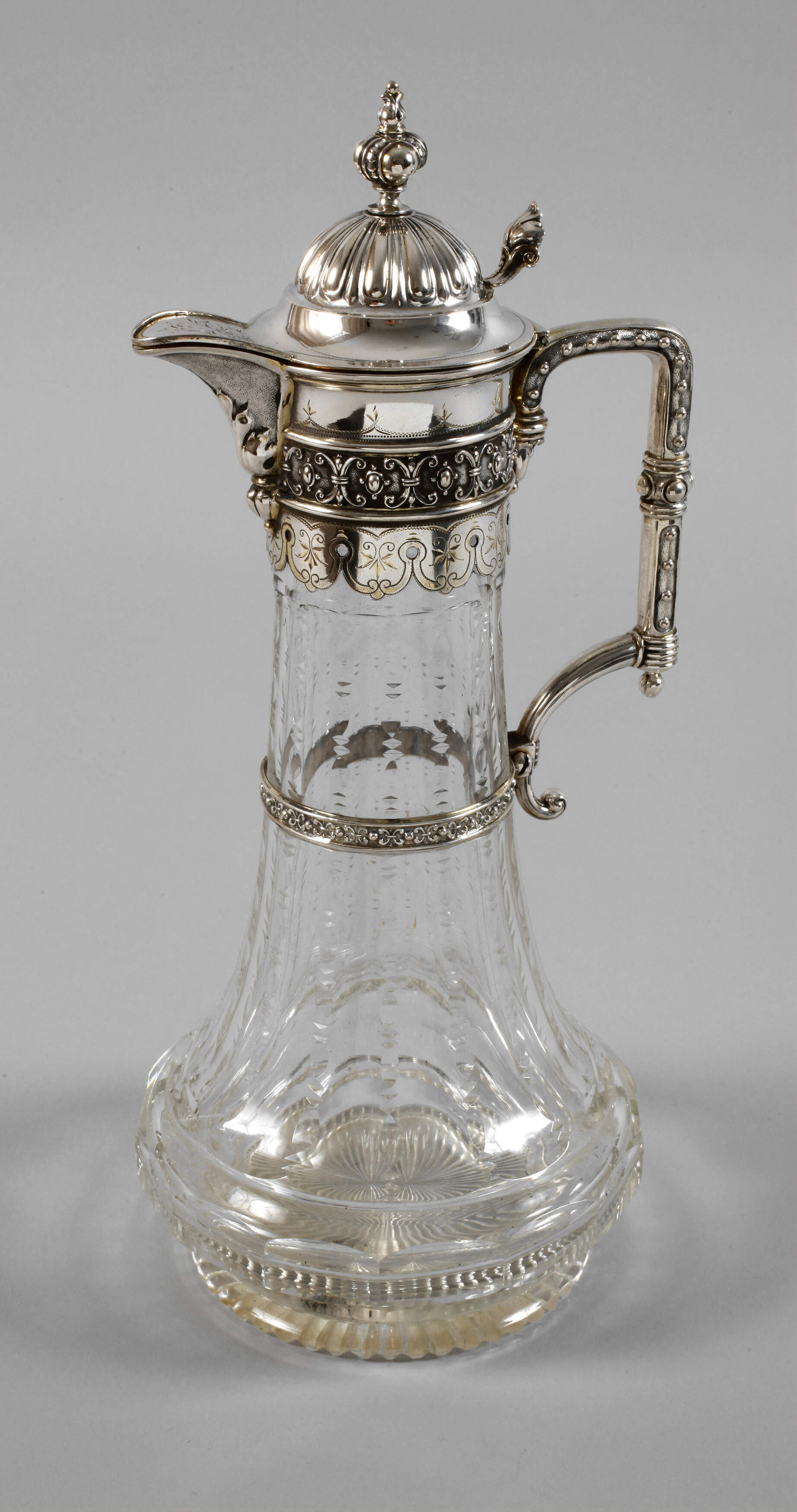 um 1890, gestempelt Halbmond, Krone, 800 M, Herstellermarke Bruckmann & Söhne/Heilbronn, Vertriebsstempel Schürmann, Silber innen vergoldet, reich verziert mit ornamentalen Reliefs und Gravuren, Korpus aus reich geschliffenem Bleiglas mit Bodenstern, Kerb-, Schäl- und Olivschliff, im Boden leichte Gebrauchsspuren, sonst guter altersgemäßer Zustand, H 32 cm.
