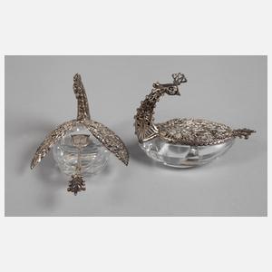 2. Hälfte 20. Jh., eine und beide Löffel gestempelt 835, die andere geprüft, Körper aus farblosem Bleikristall, bewegliche Flügel, Filigranarbeit, L je ca. 7,5 cm.