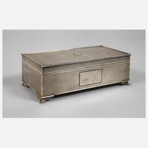 Jahresbuchstabe L für 1960, Silberpunze Lion Passant, Anker für Birmingham, Herstellermarke JR für John Rose, fein ziselierte Oberfläche mit Blütenband am Deckelrand, aufgelegter Löwe, offene Monogrammkartusche, innen mit Holz ausgekleidet, auf ausgestellten Füßen stehend, normale Altersspuren, L 12 cm.