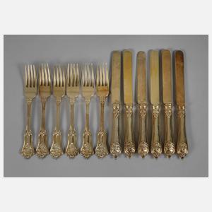 um 1890, Silber vergoldet, gestempelt 940, Halbmond, Krone, die Gabeln 800, Halbmond, Krone, Messerklingen mit Hersteller H. J. Wilm, die Gabeln mit Vertriebsstempel Gebrüder Friedlaender, sechs Messer und Gabeln, die Griffe schauseitig mit Reichsadler und bekröntem Monogramm Wilhelm Rex in rocaillenverzierten Kartuschen, geringe Gebrauchs- und Altersspuren, G total ca. 896 g.