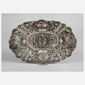 um 1920, Metall versilbert, im Spiegel Putten mit Blütengirlande in Landschaft, der Schalenbord durchbrochen gestaltet mit Gitterdekor, Rocaillen und Blütenkörben, guter Zustand, L 30 cm.