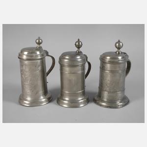 1) Johann Gottfried Schönherr Zwickau, Meister ab 1744, schauseitig mit großer Blumenvase fein geflächelt, Besitzermonogramm "J.D. Ph.", am Glockenfuß etwas gedellt, 2) Johann Carl Spiess Sagan/Schlesien, Meister ab 1778, ebenfalls reicher Blütendekor, am Stand gedellt, 3) Johann Gottfried Geelhaar Meissen (Meister ab 1781), schlichter Korpus mit Rillenbändern, Besitzermonogramm "J.G. Sp. 1814", Fuß ebenfalls minimal gedellt, H max. 25 cm.