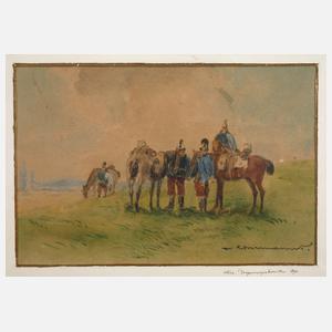 Gruppe von einigen Soldaten mit ihren Pferden in leicht hügeliger Landschaft, im Gespräch, Aquarell über Graphitvorzeichnung, unten rechts signiert "T. Ehrmanns", auf Passepartout bezeichnet und datiert "österr. Dragonerpatrouille 1890", auf Rahmenrückwand einige Aufkleber, unter anderem "Sammlung Bartsch" und "Theodor Freiherr von Ehrmanns 1843–1923", leicht gebräunt, unter Passepartout und hinter Glas gerahmt, Passepartoutausschnitt ca. 15,5 x23,5 cm. Künstlerinfo: österr. Landschaftsmaler (1843 Wien bis 1923 Wien), Studium an der Akademie in Wien bei Zimmermann, neben Wien auch tätig in München und Kopenhagen, beteiligte sich unter anderem an der Herausgabe des Prachtbandes „Österreich-Ungarn in Wort und Bild“, Quelle: Thieme-Becker und Geschichtswiki Wien.