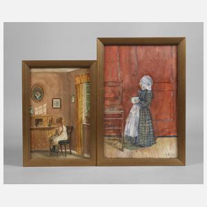 zwei Arbeiten, Kind mit Haube und Schüssel in der Hand sowie Kind am Schreibtisch beim Stricken, einfühlsame Darstellungen mit gekonnter Behandlung des Lichts, Aquarelle, eine Arbeit rechts unten signiert und datiert "K. Münzer 1902", auf einer Rahmenrückwand Infos zur Künstlerin, je hinter Glas gerahmt, Falzmaße max. 34 x 22,5 cm. Künstlerinfo: geborene Käthe [Käte] Münzer, ab 1909 verehelichte Münzer-Neumann, dt.-jüdische Malerin, Zeichnerin, Illustratorin, Plakatkünstlerin und Karikaturistin (1877 Breslau bis 1959 Paris), Schülerin der Kunstschule Berlin, um 1900 weitergebildet an der Schule des Vereins der Künstlerinnen zu Berlin bei Max Uth und Meisterschülerin von Franz Skarbina in Berlin, 1902–03 Studienreise nach Holland, ca. 1904 Studium an der Académie Julian bei Edmond François Aman-Jean (1858–1936) und Ernest Joseph Laurent (1859–1929) in Paris, hier Mitglied der Union internationale des beaux Arts et des Lettres Paris, unterhielt ab 1904 ein Schüleratelier in Berlin, unternahm ab 1909 Studienreise nach Paris, ca. 1911/12 in Warschau und 1921 in St. Petersburg erwähnt, darüber hinaus in Kopenhagen/Dänemark, spätestens ab 1929 bis 1933 in Berlin, hier laut Dressler 1930 unter anderem als Beisitzerin der Prüfstelle Berlin für Schund- und Schmutzschriften tätig, Mitarbeiterin der Münchner Zeitschriften "Jugend" und "Fliegende Blätter" sowie der Berliner Satire-Zeitschriften "Narrenschiff" und "Ulk", beschickte ab 1899 die Großen Berliner Kunstausstellungen, die Ausstellungen der Berliner Secession und des Lyceum-Clubs, 1904–33 Mitglied des Vereins der Künstlerinnen zu Berlin, an deren Kunstschauen sie sich 1904–33 beteiligte, Mitglied im Frauenkunstverband, im Berliner Künstlerverein, in der Allgemeinen deutschen Kunstgenossenschaft und im Reichsverband bildender Künstler Deutschlands, 1933 Emigration nach Paris, hier Mitglied des "Freien Künstlerbundes 1938", während der dt. Besatzung von Paris überlebt die Künstlerin im Untergrund, nach 1945 Anschluss an die Societé des Artistes Francais, die Societé Nationale des Beaux Arts, beschickte den Salon d’Automne, den Salon des Indépendants und den Salon des Humoristes, Quelle: Thieme-Becker, Vollmer, Saur "Bio-Bibliographisches Künstlerlexikon", Dressler, Bénézit, Wikipedia, "Käthe, Paula und der ganze Rest" und Artikel von Carola Muysers.