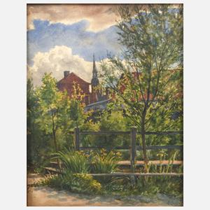 idyllischer Blick durch Laubbäume auf ein paar Häuser und einen darüber ragenden Kirchturm, Aquarell auf Papier, rechts unten signiert und datiert "Emil Schultz 1915", auf der Rahmenrückwand in Blei teils unleserlich bezeichnet "Emil Schultz-Riga Orig. Aquarell sign + dat. ... betitelt "Aus Riga", leicht gebräunt und minimal fleckig, hinter Glas gerahmt, Falzmaße ca. 26 x 21 cm. Künstlerinfo: balten-dt. Maler (1872 Dünaburg [Daugavpils] bis 1931 Düsseldorf?), studierte 1892–98 an der Akademie in Düsseldorf, Mitglied im Reichsverband Bildender Künstler Deutschlands, in der Allgemeinen Deutschen Kunstgenossenschaft und im Künstlerverein Malkasten Düsseldorf, tätig in Düsseldorf, Quelle: Dressler, Archiv des Künstlervereins Malkasten und Internet.