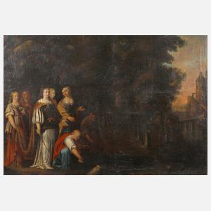 Darstellung der alttestamentarischen Szene der Auffindung des Moses, die Bibel berichtet davon, dass die Nachkommen Jakobs sich in Ägypten rege vermehrten, als ein neuer Pharao an die Macht kam, argwöhnte dieser, dass das Volk der Israeliten zu mächtig würde und Ägypten hieraus ein innerer Feind erwüchse, der Pharao ordnete daraufhin an, dass alle männlichen Neugeborenen umzubringen seien, in dieser Zeit gebar eine jüdische Frau einen schönen Sohn und nach drei Monaten, als sie ihn nicht mehr gefahrlos verbergen konnte, legte sie den Säugling in ein mit Teer abgedichtetes Binsenkästchen und setzte es am Nilufer aus und ließ es von der kleinen Schwester des Knaben bewachen, die folgende - auch im Gemälde dargestellte Begebenheit beschreibt das Buch Mose (2,5-10) wie folgt "... Die Tochter des Pharao kam herab, um im Nil zu baden. Ihre Dienerinnen gingen unterdessen am Nilufer auf und ab. Auf einmal sah sie im Schilf das Kästchen und ließ es durch ihre Magd holen. Als sie es öffnete und hineinsah, lag ein weinendes Kind darin. Sie hatte Mitleid mit ihm und sie sagte: Das ist ein Hebräerkind. Da sagte seine Schwester zur Tochter des Pharao: Soll ich zu den Hebräerinnen gehen und dir eine Amme rufen, damit sie dir das Kind stillt? Die Tochter des Pharao antwortete ihr: Ja, geh! Das Mädchen ging und rief die Mutter des Knaben herbei. Die Tochter des Pharao sagte zu ihr: Nimm das Kind mit und still es mir! Ich werde dich dafür entlohnen. Die Frau nahm das Kind zu sich und stillte es. Als der Knabe größer geworden war, brachte sie ihn der Tochter des Pharao. Diese nahm ihn als Sohn an, nannte ihn Mose und sagte: Ich habe ihn aus dem Wasser gezogen. ...", die dargestellte Szene wurde vom Künstler in eine europäische Phantasielandschaft eingebettet und auch die Pharaonentochter in ihrer kostbaren hermelinverbrämten Robe erinnert an europäische Herrscher des 17. Jh., pastose, religiöse, barocke Genremalerei, Öl auf Leinwand, um 1700, unsigniert, rückseitig gestempelt "Hagans Erfurt 3. Dez. 1954", Craquelure, Farbaufschüsselungen, hinterlegte Fehlstelle in der Leinwand, alt restauriert, restaurierungsbedürftig, in ca. 7 cm breiter Berliner Leiste gerahmt, Falzmaße ca. 73,5 x 103,5 cm.