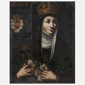 jüngere Frau im Gewand einer Nonne, mit Krone auf ihrem Haupt und Rosen in ihren Händen, links Wappen und im oberen Bereich bezeichnet "Elisabetca DAP", vermutlich Darstellung der Heiligen Elisabeth von Thüringen, minimal pastose Malerei, Öl auf Leinwand, wohl 17. Jh., Craquelure, farbschwundrissig, Keilrahmen defekt, restaurierungsbedürftig, ungerahmt, Maße ca. 82 x 64,5 cm.