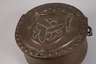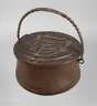 Nürnberg, 18. Jh., Kupfer, mehrteilig gearbeitet und montiert, getrieben und in Hammerschlagdekor verziert, leicht gebauchter Korpus mit geteiltem, scharniertem Deckel, dieser reliefiert mit verschlungenen Fischen, Bügelhenkel aus gedreht gerippt geformten Schmiedeeisen, Alters- und Gebrauchsspuren, D 29 cm.