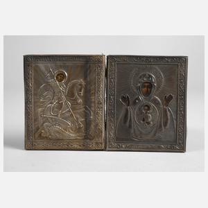 Russland, datiert 1890, Silber gestempelt 84 Zolotniki, Stadtmarke St. Petersburg, Meistermarke AC, kirchenslawisch bezeichnet, Öl auf Holz, miniaturhafte Darstellung Georg des Drachentöters und der Gottesmutter des Zeichens, jeweils mit fein ziseliertem Oklad, Altersspuren, Maße je 8,5 x 7 cm.