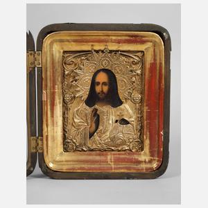 19. Jh., ungemarkt, Tempera auf Holz, ornamental reliefiertes Oklad aus getriebenem Messing, Halbfigurenbildnis Jesu im Segensgestus mit Weltenkugel, im verglasten Holzkasten hinter schmaler profilierter Leiste gefasst, Altersspuren, Maße 26 x 22 cm.