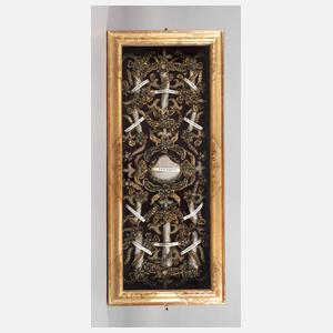 20. Jh., im hochrechteckigen Schaukasten aufwendig über samtenem Fond präsentiertes Reliquienbild aus von hellgrauer Seide umspannten Knochensegmenten?, gerahmt von üppigem Ornament, Blütenranken und Zierrat aus Gold- und Silberlitze, Saatperlen und Farbcabochons sowie handschriftliche Tituli aus Papier, leichte Altersspuren, Maße 96 x 44 x 7 cm.