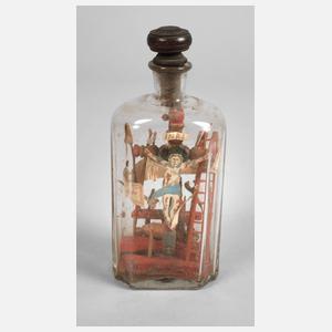 19. Jh., Flasche aus leicht blasigem Klarglas, das Innenleben zeigt eine Kreuzigungsszene mit Schriftzug anno 1743 den sechzehnten December Corneliues ... in Craborgh, aus geschnitztem bzw. farbig gefasstem Holz gefertigte Szene mit papiernem Korpus Christi und Leidenswerkzeugen, Altersspuren, H 18 cm.