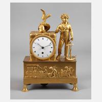 Frankreich, 2. Hälfte 19. Jh., Bronze und Messing vergoldet und partiell poliert, seitlich neben dem Werk ein junger Bub mit Vogelnest, makelloses Ziffernblatt mit blauen römischen Ziffern und arabischer Minuterie, Pendulenwerk signiert G. Schmoll Paris, mit Halbstundenschlag auf Glocke, Werk ist gehfähig, H 25 cm.