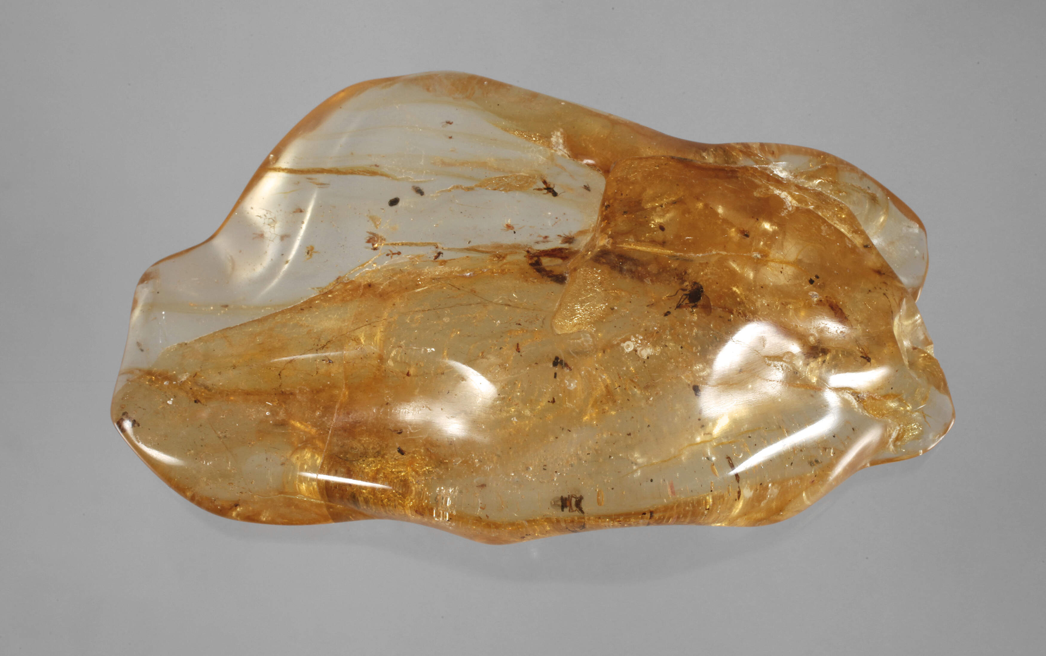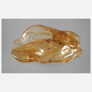 unbestimmten Alters, poliertes, organisch geformtes Segment aus sehr klarem honigfarbenen Bernstein mit Inklusion eines Insekts, L 11 cm, G ca. 84 g.