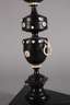 um 1800, ebonisierte Basis in Dreiecksform auf drei Kugelfüßen, der Schaft balusterförmig aus Ebenholz gefertigt, mit Zierelementen aus Bein, bekrönt von montiertem Straußenei mit zapfenförmigem Abschluss, nicht ganz komplett, Altersspuren, H 50 cm.