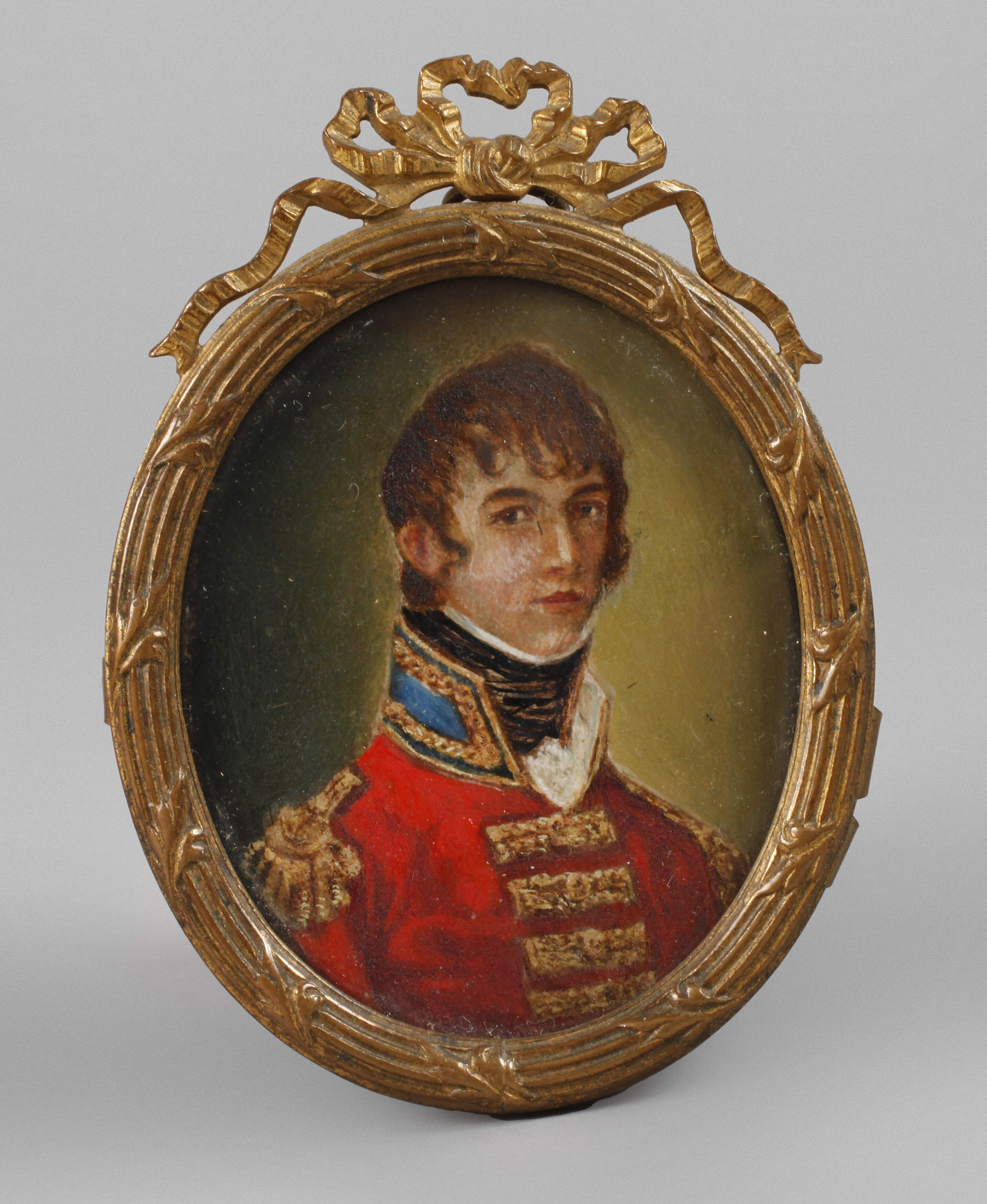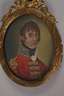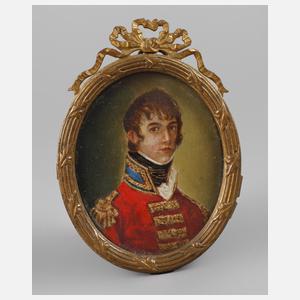 Berlin, 19. Jh., gestempelt Moritz Pathe Portraitmaler, rückseitig handschriftlich annotiert mit Angaben zum Dargestellten, Öl auf Karton, Schulterstück eines jungen Mannes in Uniform, hinter Glas in schleifenbekröntem Messingrahmen gefasst, Altersspuren, Maße ca. 7,5 x 5,5 cm.