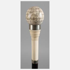 Anfang 20. Jh., hoher schlanker Knauf mit kugeligem Aufsatz als Erdkugel, aufwendig graviert und bezeichnet, versilberte Manschette, ebonisierter Holzschuss, Messingzwinge, L 91 cm.
