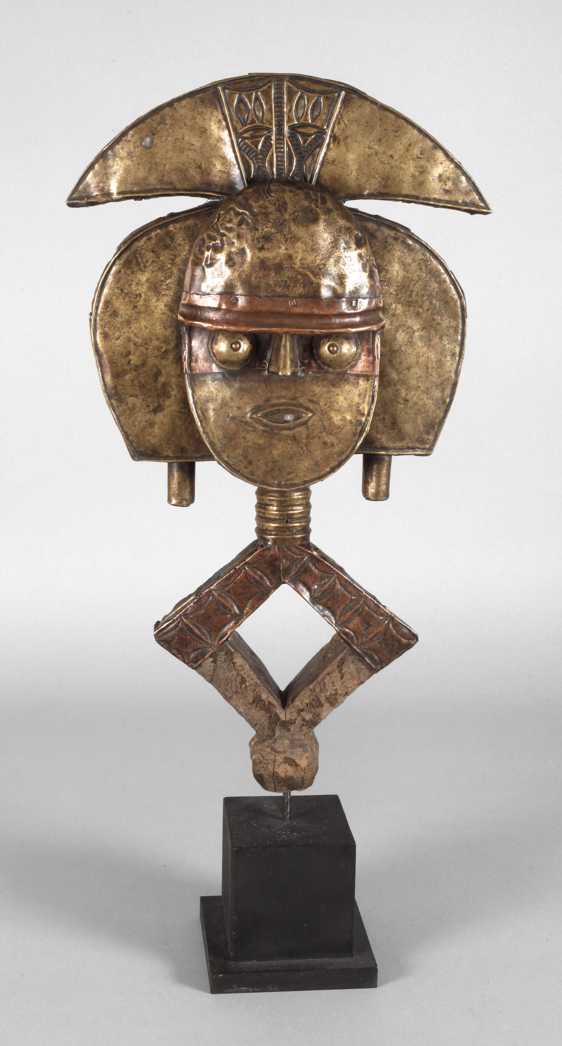 der Volksgruppe der Kota Obamba zugeordnet, Gabun, Ende 19. Jh., dunkles Wurzelholz beschnitzt, aufwendig mit Kupfer- und Messingblech verkleidet, getrieben und ornamental punziert, diese Figuren standen auf einem Korb, der die Gebeine der Ahnen enthielt und konnte wie ein Prisma die intensive Kraft der Reliquie verstärken und konzentrieren, Altersspuren, kleinere Erhaltungsmängel, auf späterem Holzsockel montiert, H 70 cm.