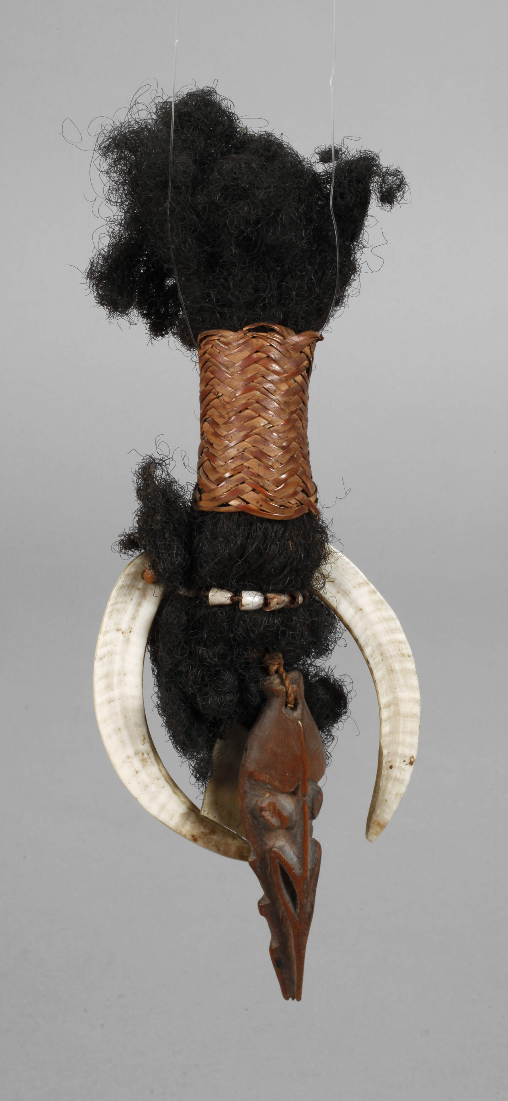 wohl Westafrika, 20. Jh., mit Naturfasern gebundenes Ritualobjekt aus Echthaar, hölzerner Schnitzmaske, Muschelschale und Warzenschweinhauer, Altersspuren, H ca. 20 cm.