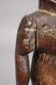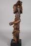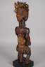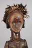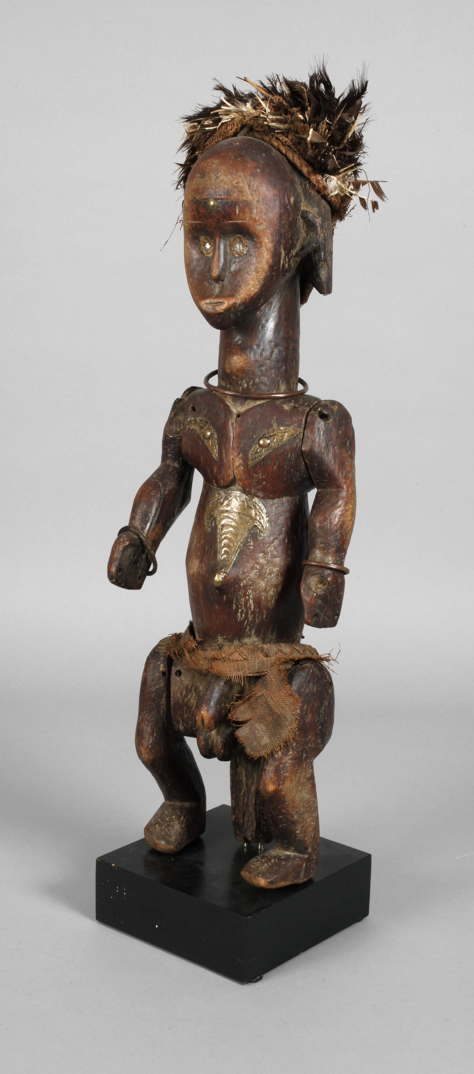 der Volksgruppe der Fang zugeordnet, Gabun, Fang, 20. Jh., dunkles Laubholz beschnitzt, dunkel gefasst, getriebene Metallmontierungen, sitzende männliche Gestalt, verziert von zarten Kupferringen mit beweglichen Armen, das flach gestaltete Gesicht mit verspiegelten Augen, üppiger Kopfschmuck aus Federn und Pflanzenfasern, textiler Schurz, auf späterem Sockel montiert, Erhaltungsmängel, H ca. 70 cm.