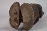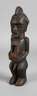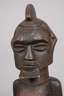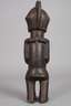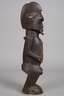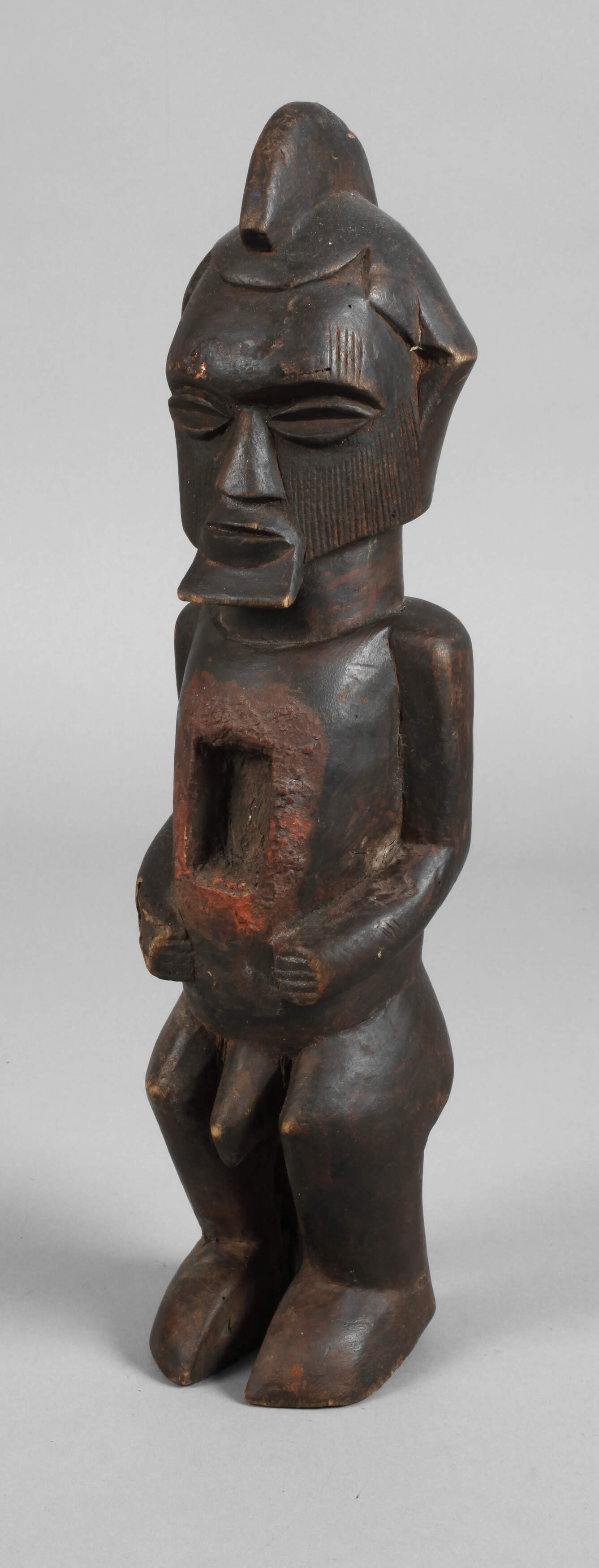 der Volksgruppe der Teke zugeordnet, Kongo, 20. Jh., Holz geschnitzt, dunkel gefasst, klassische männliche Fetischfigur mit angedeutetem stilisierten Kinnbart, helmartiger Bekrönung mit Haarkamm und linienförmigen Narbentatauierungen über große Teile des Gesichts, der Torso mit eingelassener rechteckiger und rot abgesetzter Öffnung, kleinere Substanzverluste, Altersspuren, H 40 cm. Info: die Teke schnitzten unterschiedliche Arten von Zauberfiguren, die mit diversen magischen Substanzen versehen wurden, welche unterschiedlichsten Funktionen inne hatten.