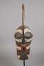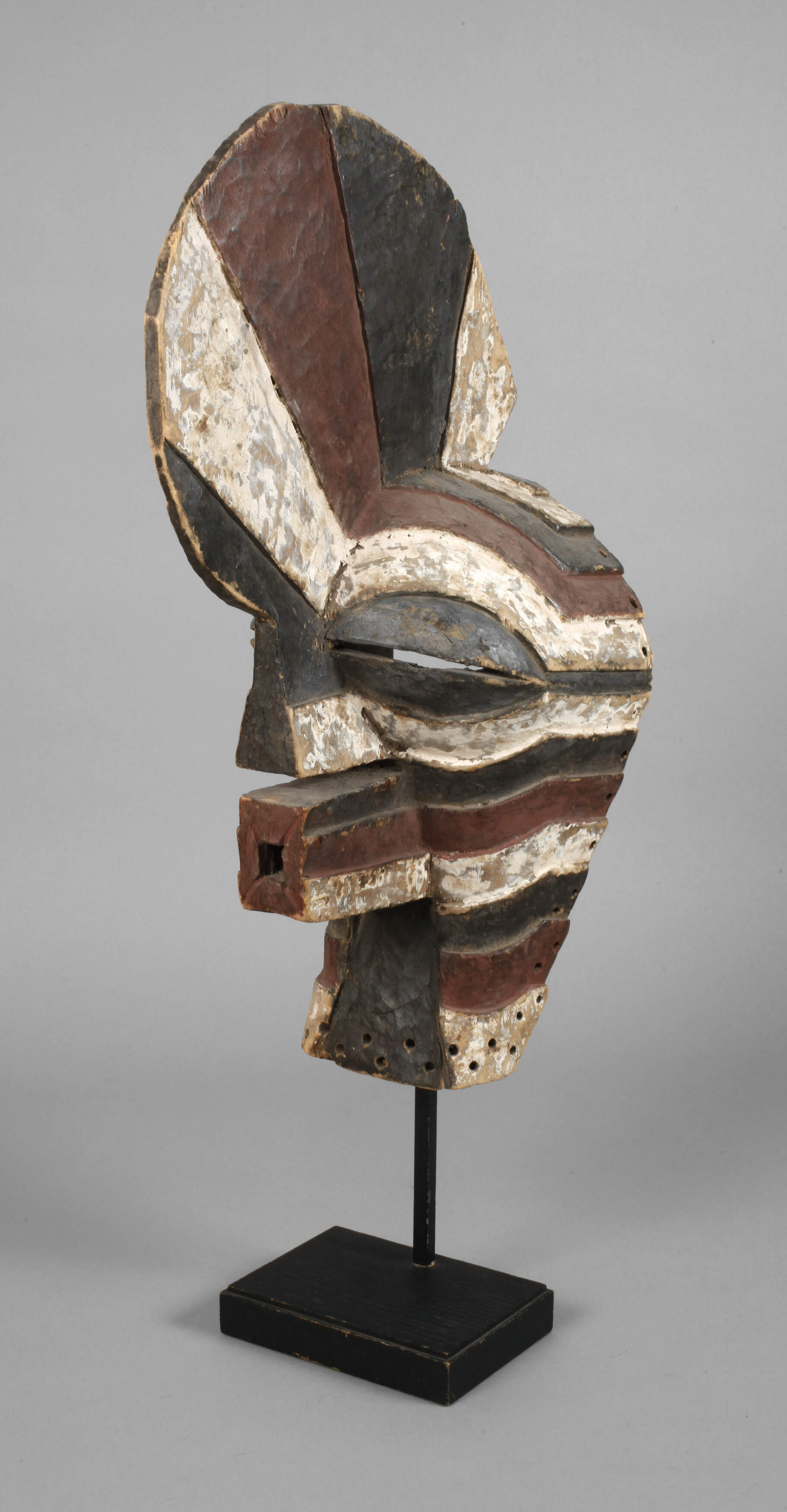 der Volksgruppe der Songye zugeordnet, Kongo, 1. Hälfte 20. Jh., Hartholz beschnitzt und mehrfarbig gefasst, abstrahierte Gesichtermaske mit schmalen Öffnungen für Augen, röhrenartig gestalteter Mund mit quadratischem Querschnitt sowie hohem Kamm, komplett profiliert, Ösen für Textilbesatz, kleinere Substanzverluste, mit Aufsteller, H ca. 60 cm.