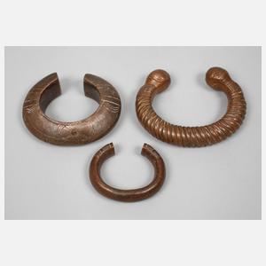 Westafrika, 20. Jh., Kupfer massiv, teils ornamental punziert, drei verschieden große Reife als Währung, Alters- und Korrosionsspuren, D max. 13 cm.