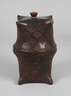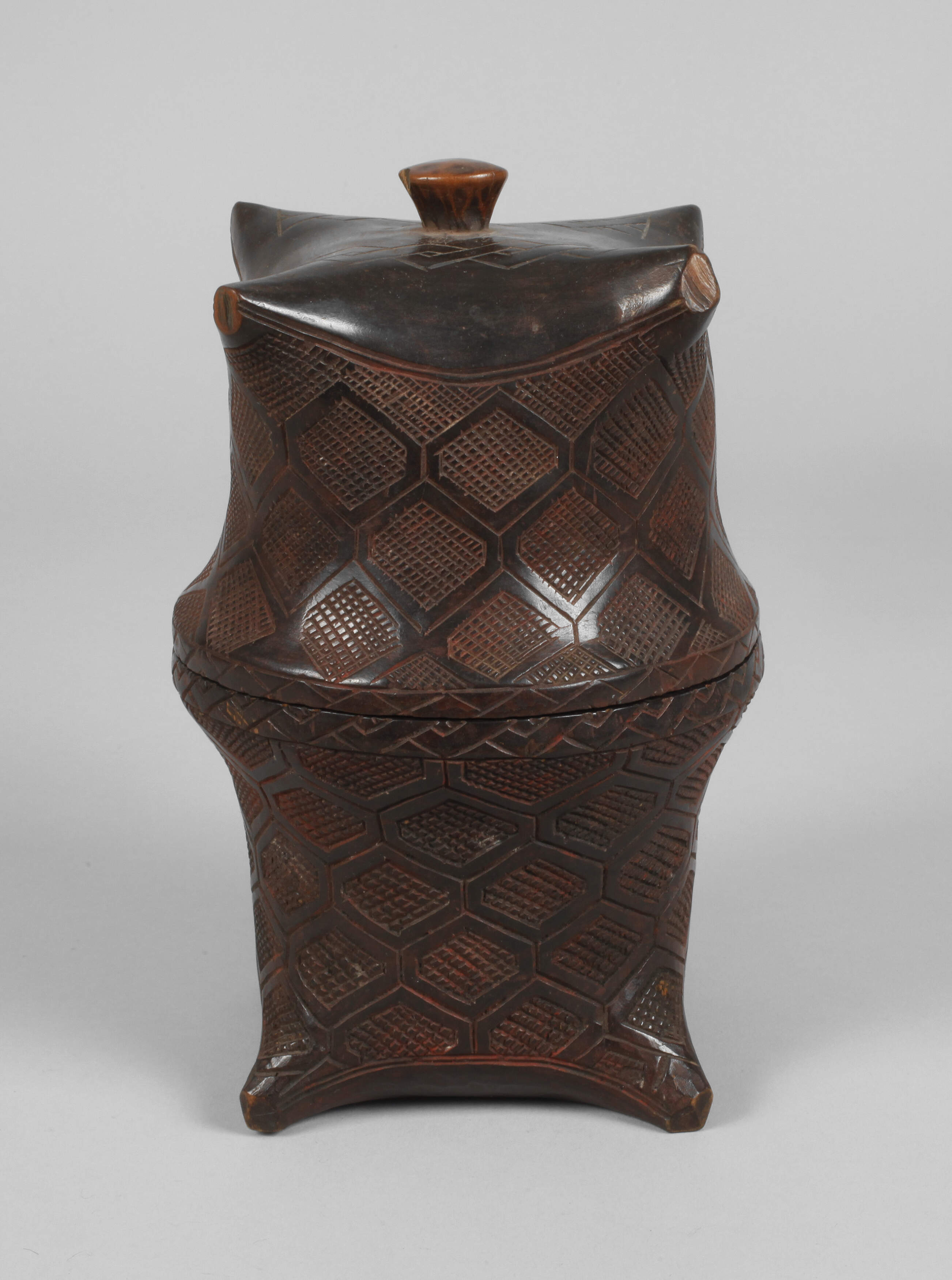 Ende 19. Jh., aus Missionarsstift, Holz fein beschnitzt, Deckel mit Spannungsriss, am Boden mit altem Klebezettel, H 23 cm.