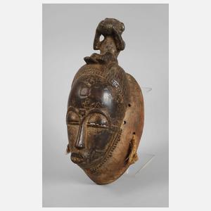 der Volksgruppe der Guro zugeordnet, Elfenbeinküste, 2. Hälfte 20. Jh., Holz beschnitzt, Maske mit aufsitzendem Affen, welcher mit den Händen seine Augen verdeckt, feine Patina, H 30 cm.